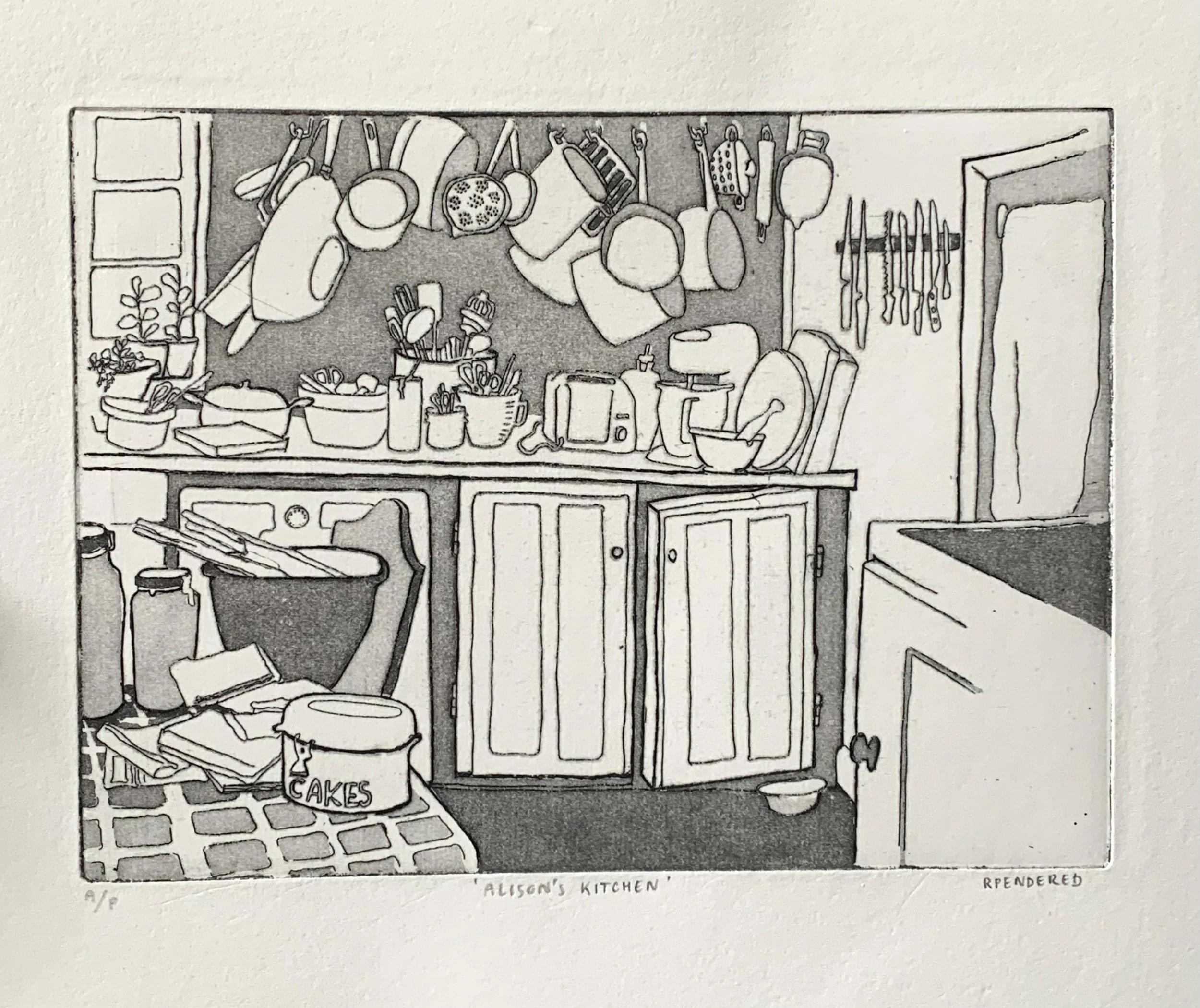 My first drypoint etching and aquatint of Alison’s farmhouse kitchen. This image was originally a drawing in my sketchbook that I traced onto an etching plate.
