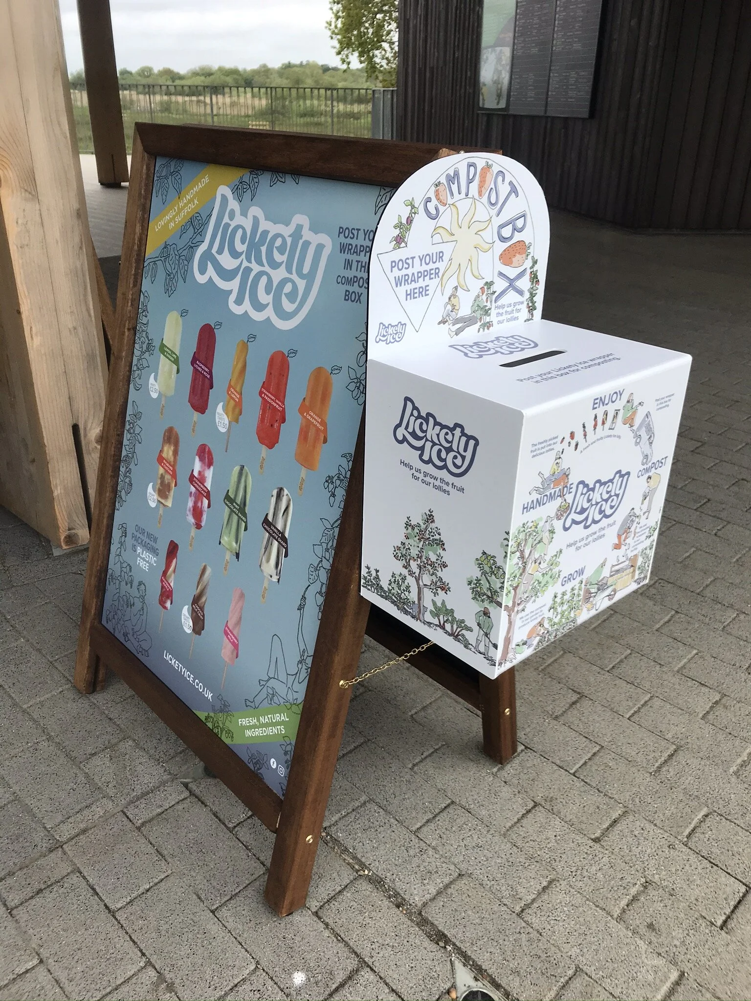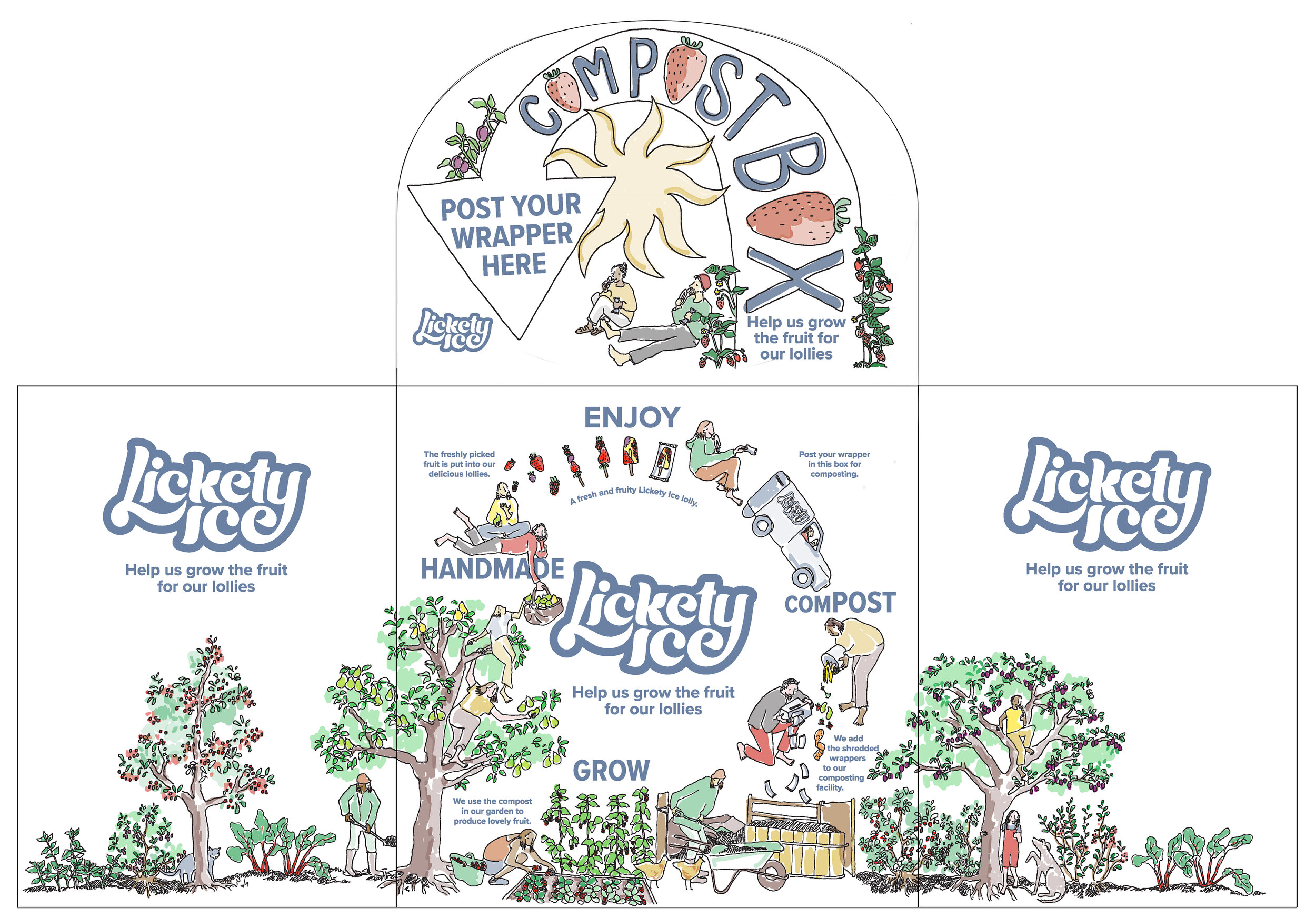 I had the pleasure of working with Lickety Ice on their new compostable packaging, launched summer 2021. This comprised of an illustrated com’post’ bin to collect the wrappers, an illustrated A-frame board, and 12 label designs for their lollies.