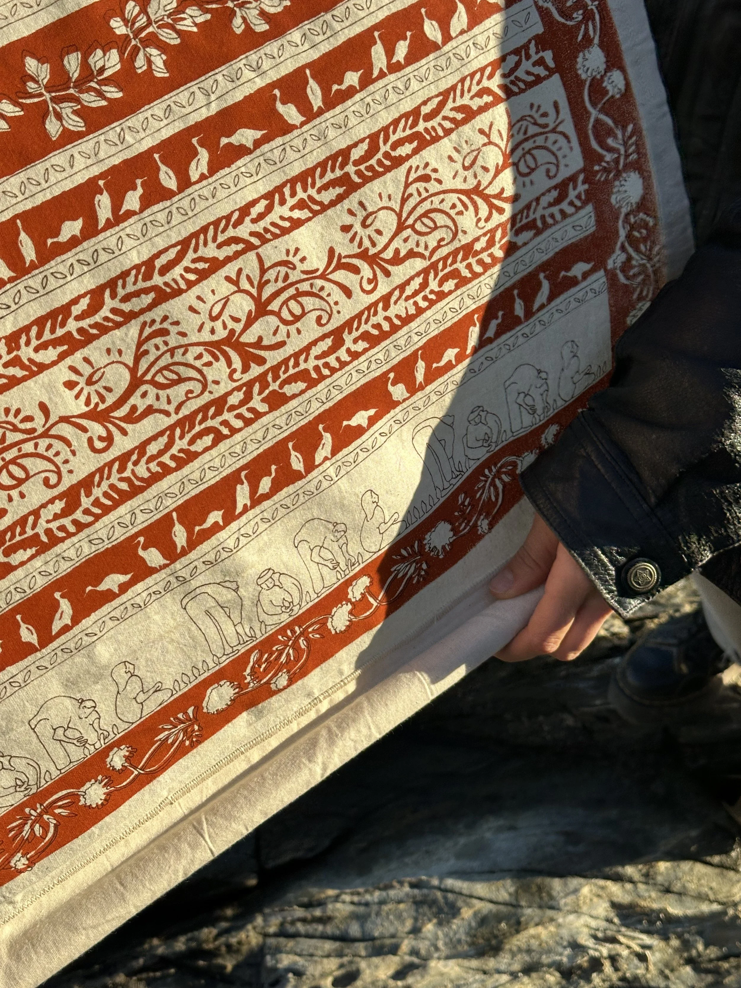 Inspired by Navdanya, Vandana Siva’s Earth University in India. Navdanya promotes biodiversity conservation and Earth Democracy. ‘Marigold borders’ is inspired by our time spent on the farm, learning organic growing practises such as growing natural pesticides, seed saving, crop diversity, and soil health. This print is inspired by the importance of community and our collective responsibility and connection to the land, working alongside and protecting the rights of other species. Inspired by Indian wood block prints.