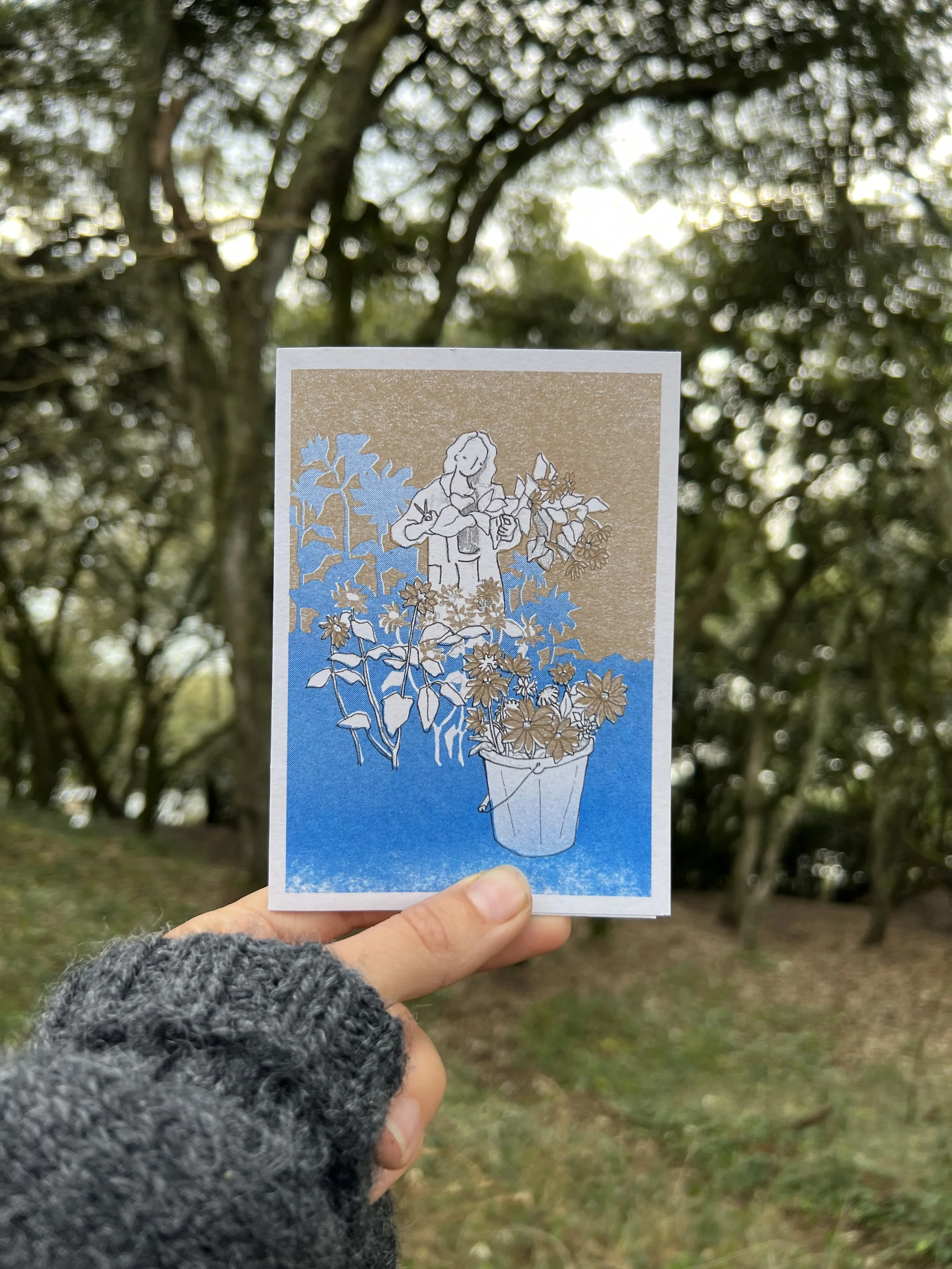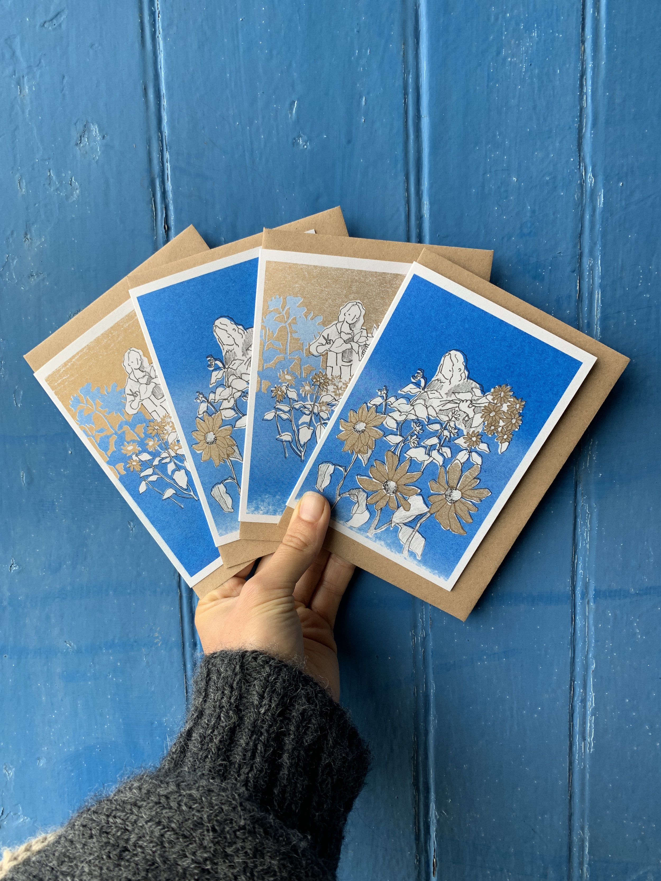 Risograph printed with blue, black and gold soya-based inks on recycled paper by Roots Press based in Porthtowan, Cornwall.